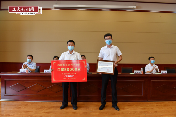 阿里云创新中心(长春)为学校捐赠了50000支口罩,用于校园疫情防控工作。张会轩代表学校向爱心企业颁发了捐助证书。