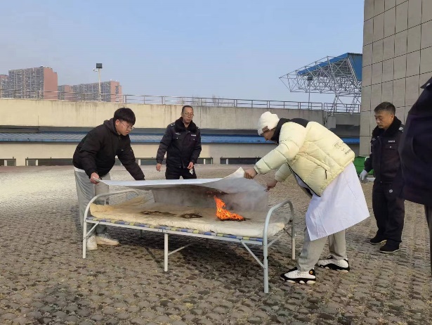 同学们正在演习用灭火毯灭火